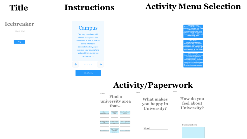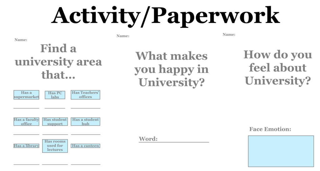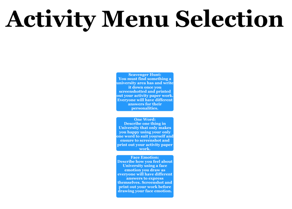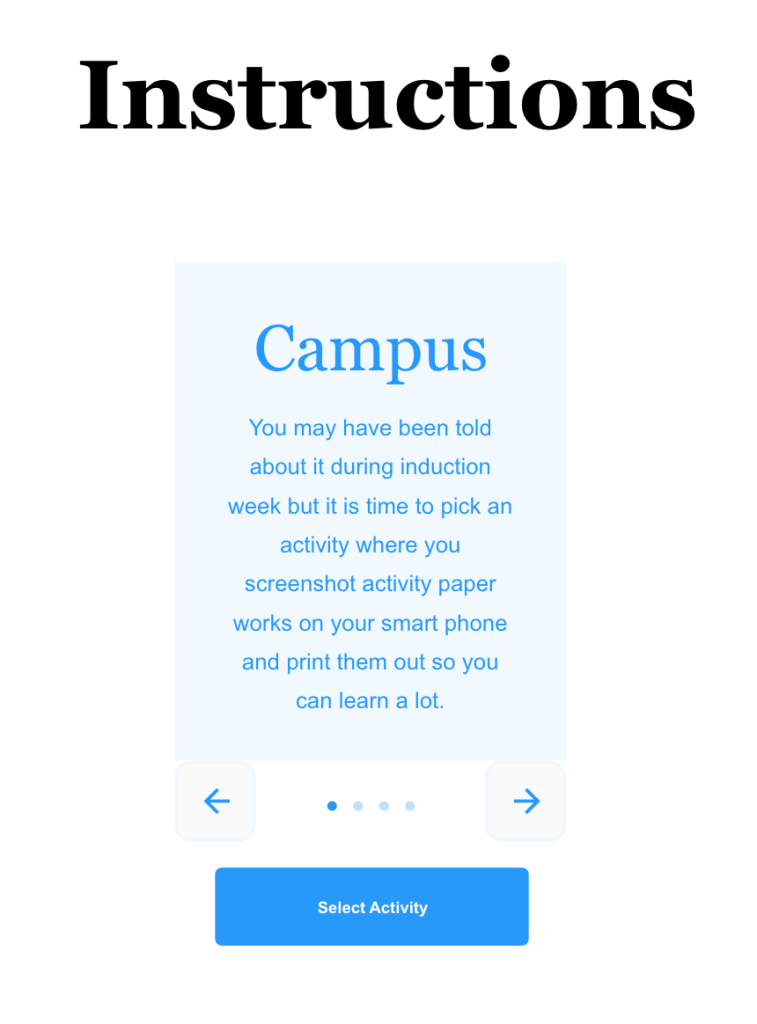 This is a storyboard for three activities/paper works I have added using wireframes where I want to make students able to screenshot on their smart phones and print out their paper work to start their activities.