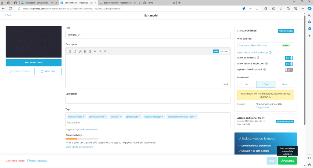 Since this was saved as a draft, I then went on a PC to screenshot the process of publishing my project to Sketchfab, adding the title and tags, but I also had the option of adding descriptions, which I did not prefer to.