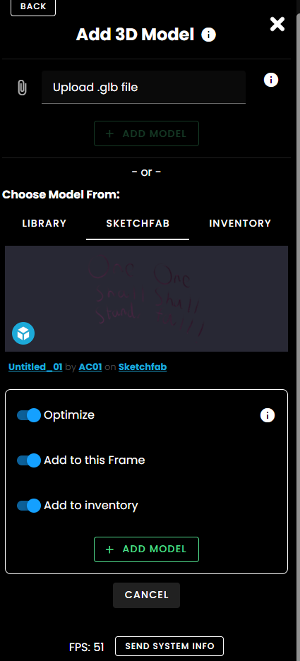 I then went on my FrameVR to add a Sketchfab Model, typing my model and adding it to my frame where I also added it to my model inventory. I also made my Open Brush object spin around, switching Spin on for it.