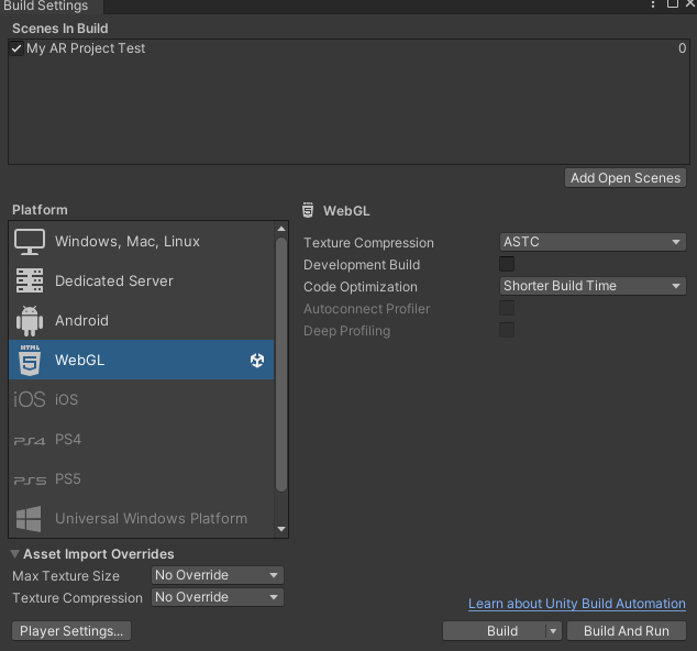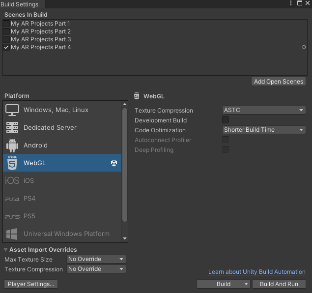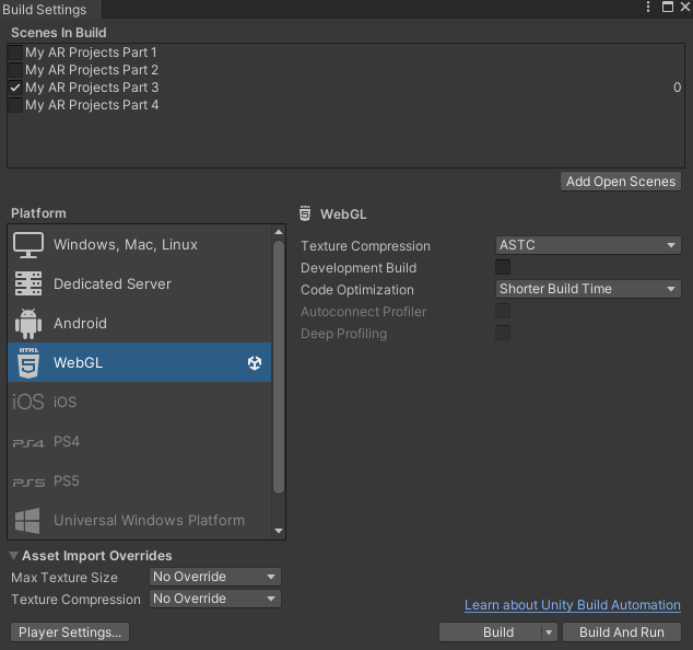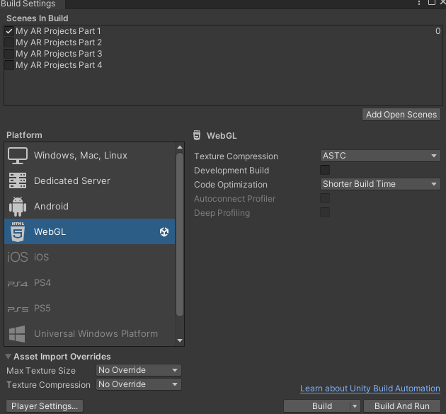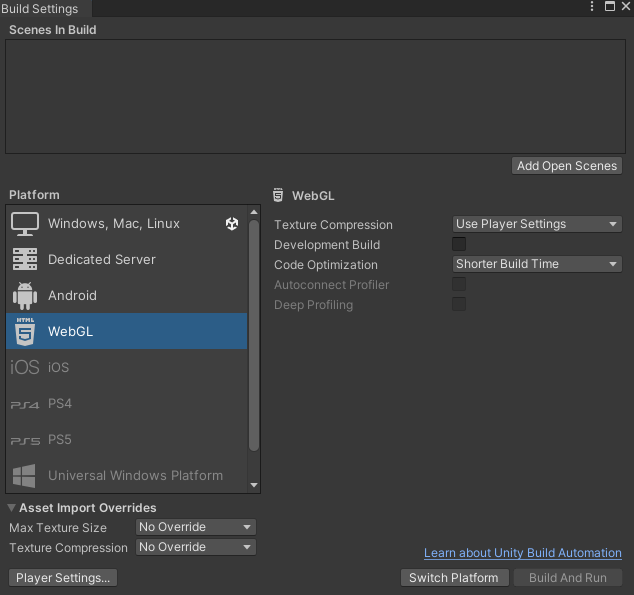 Firstly, I made a new Unity scene and saved my project on a University PC where there is plenty enough data for it to be saved before I went on build settings and switched platforms from PCs to WebGL by clicking on WebGL and then the Switch Platform button.