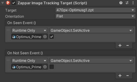 Then, I went through the same process as I did for my Sea Shack AR projects for my Optimus Prime AR Model, adding On Seen and On Not Seen events, and giving them Set Active Booleans where I ticked the model on the On Seen and unticked the model on the On Not Seen event.
