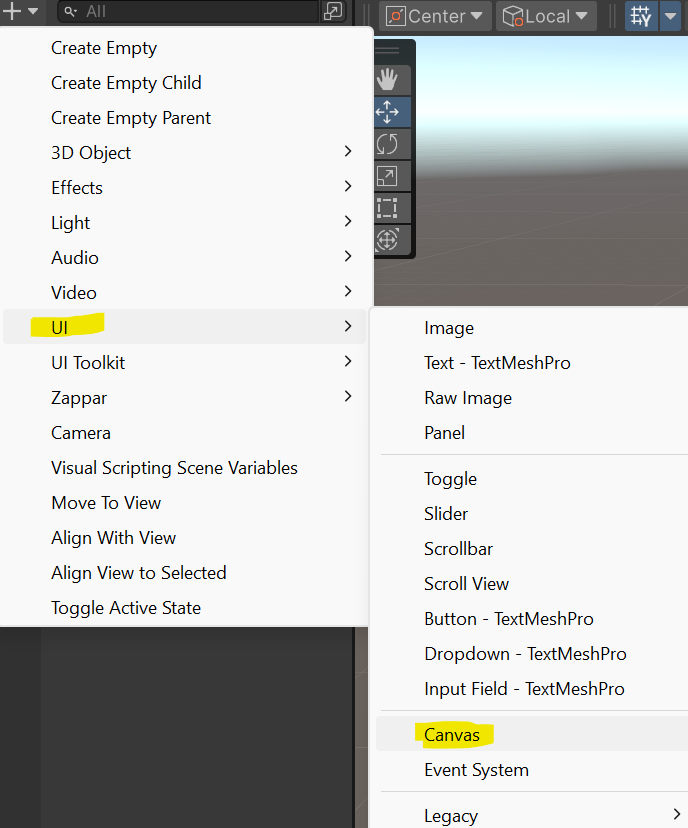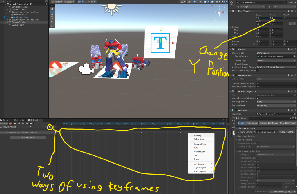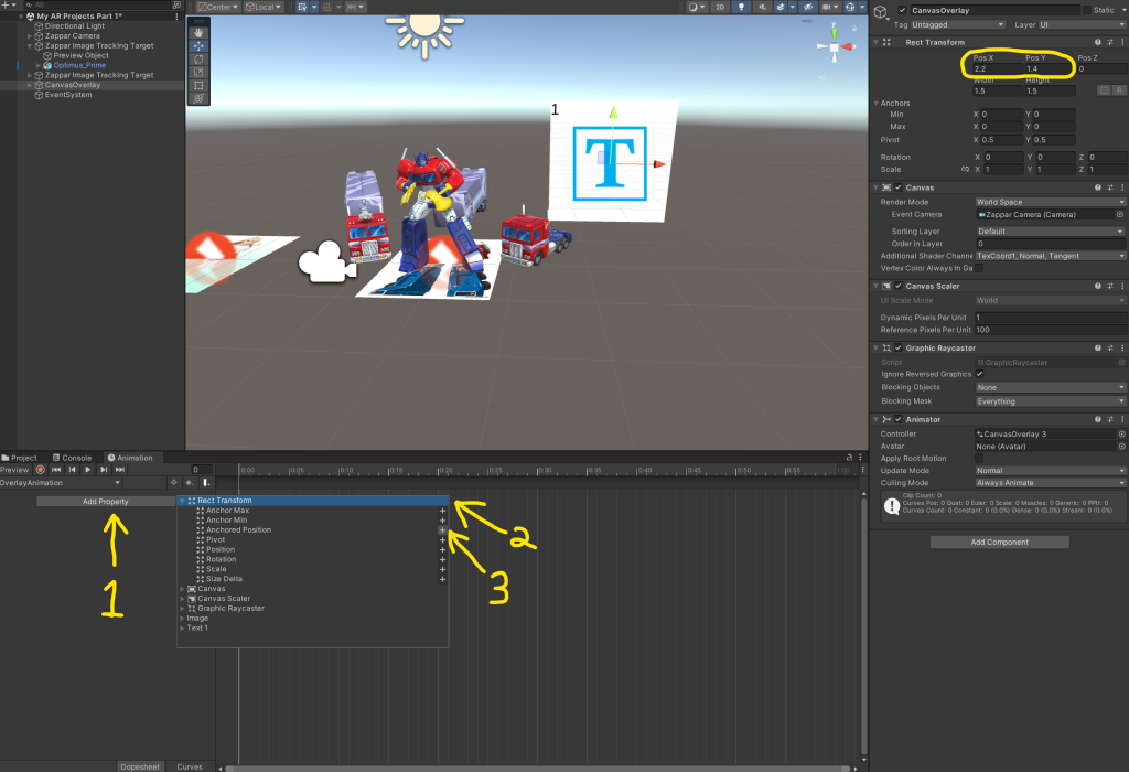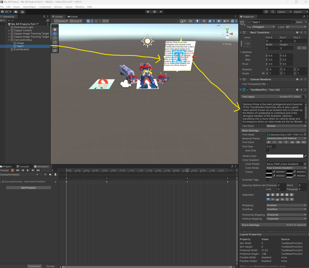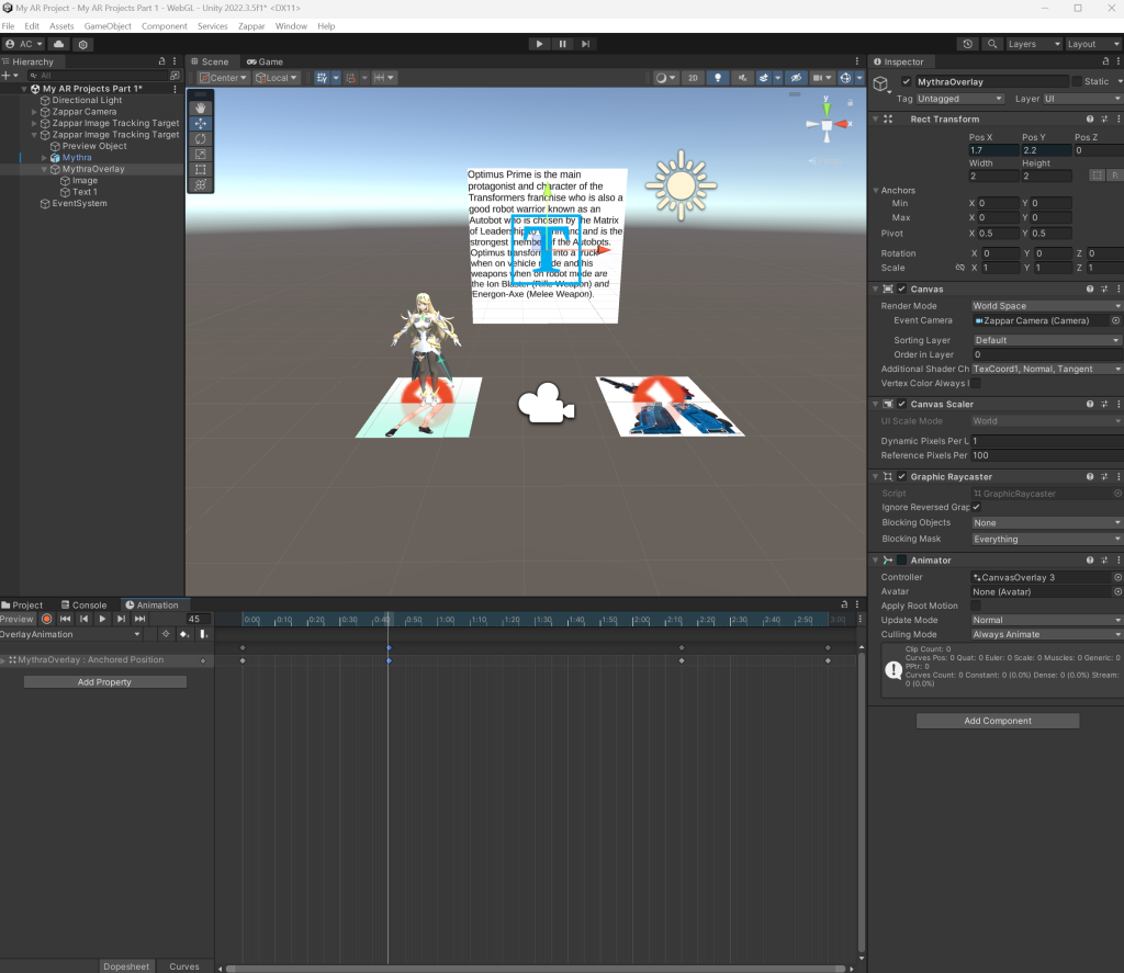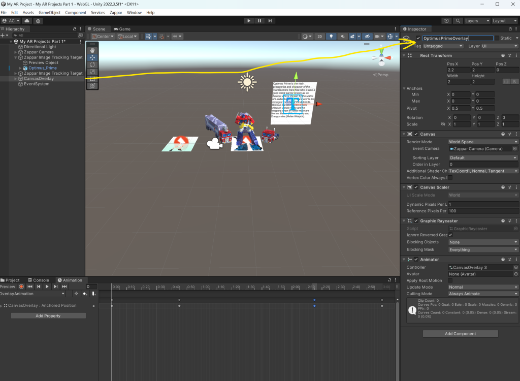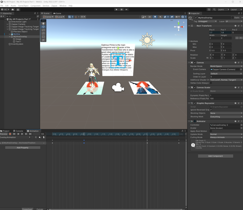 There are a whole variety of new techniques I have learnt as I decided to add overlays with animations and showing texts with a few sentences to make a paragraph of facts about characters I have brought for AR projects. First I made a canvas via the + sign, UI and Canvas, bringing up a CanvasOverlay for my Optimus Prime AR tracker.