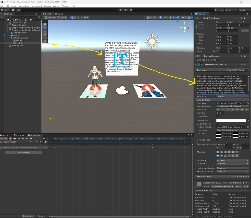 After sorting my overlay animation out, I went through the same process of changing text fonts to black on a white overlay background and typing a few sentences for the description about Mythra.