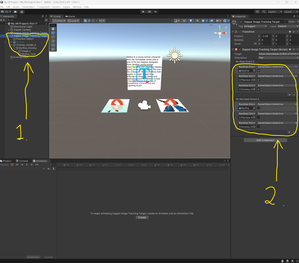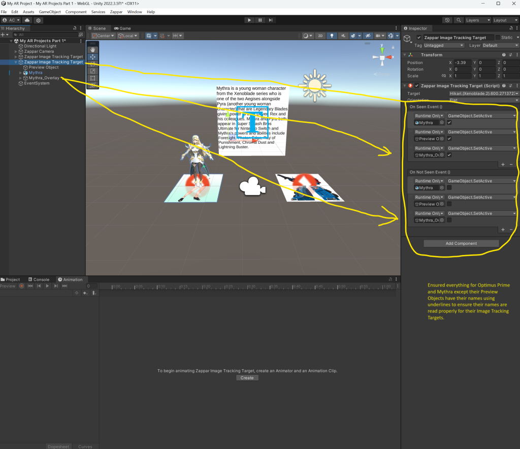 I then added On Seen and On Not Seen events for every Preview Object resembling AR trackers for every single character and repeated the same process as I did for every character’s model, ensuring AR images and Models of every character are only seen when users phones/tablets point at their trackers.
