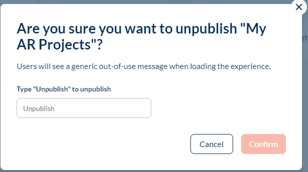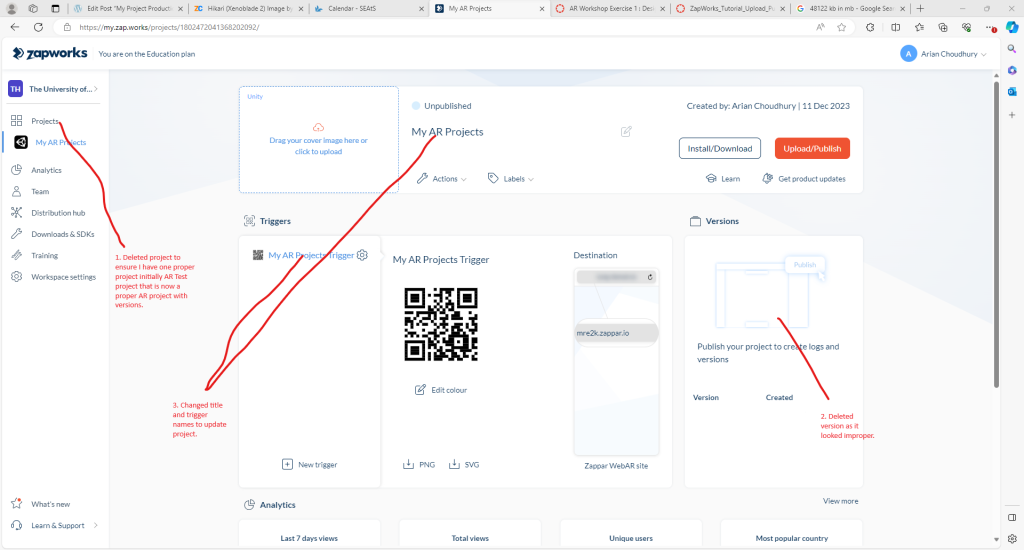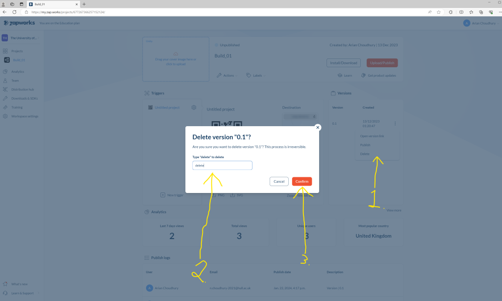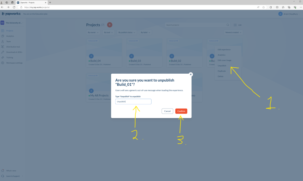 These are a couple of new techniques I have learnt at the time I had to sort projects out since adding a build for all character AR tracker in one wasn’t a good idea. I had to read pop-ups of unpublishing and deleting projects and proceeded to type Unpublish to unpublish projects and versions and Delete to delete any that I do not need.