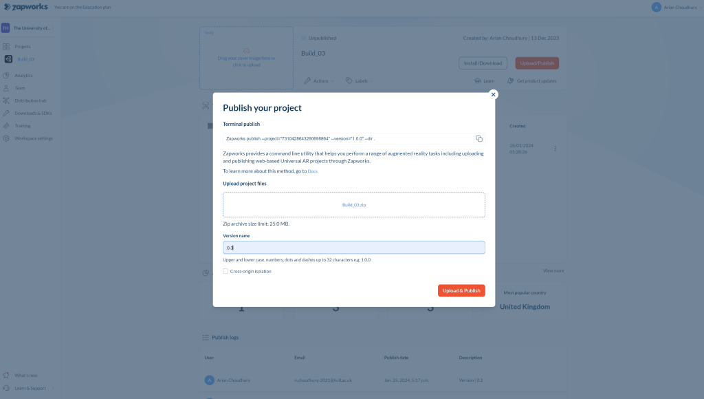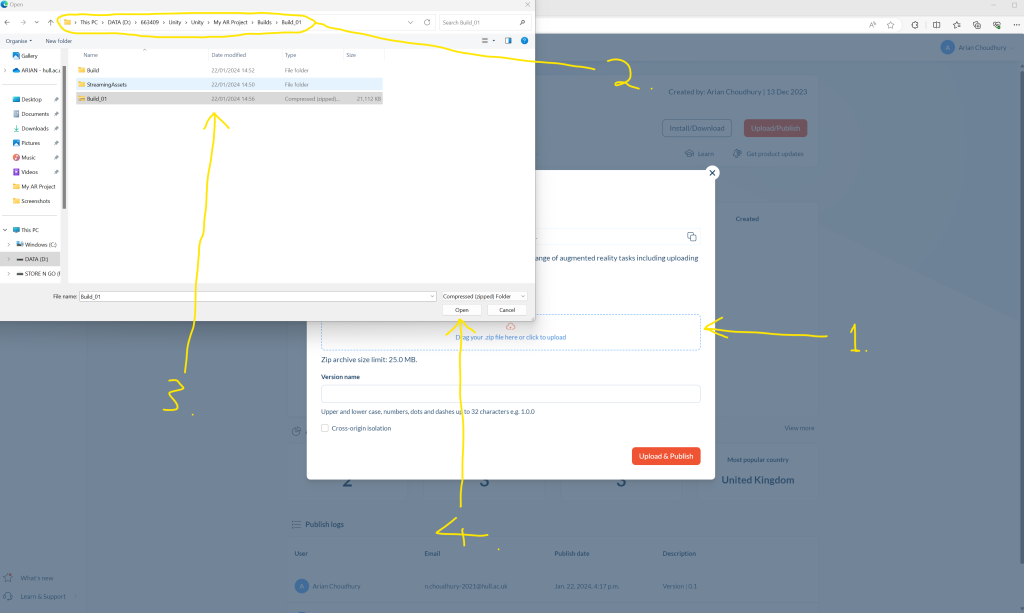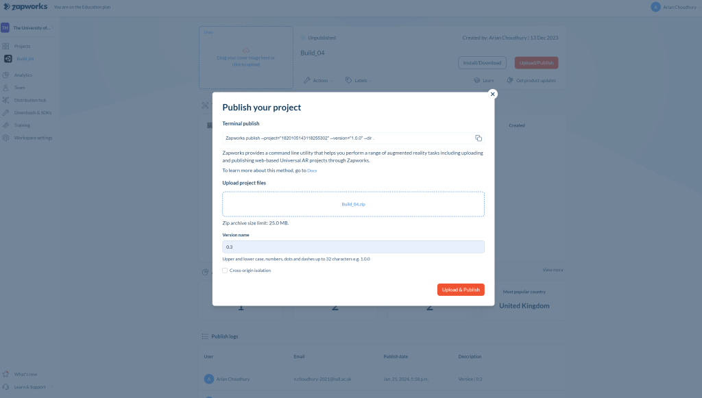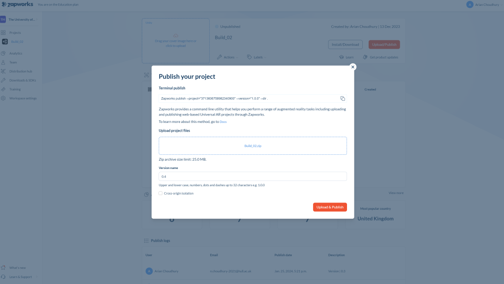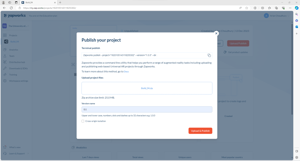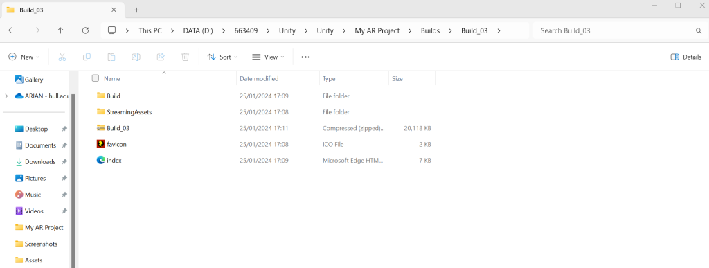 I then went through the same process of building my project as I have rebuilt Build_01 in order for its zipped folder to have under 25 MB in size ready to be published on Zapworks.