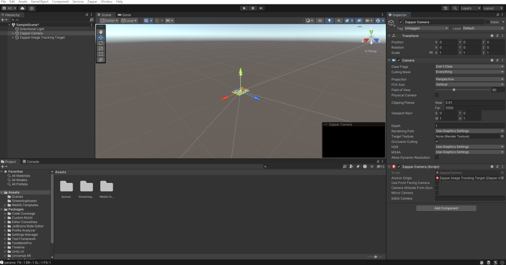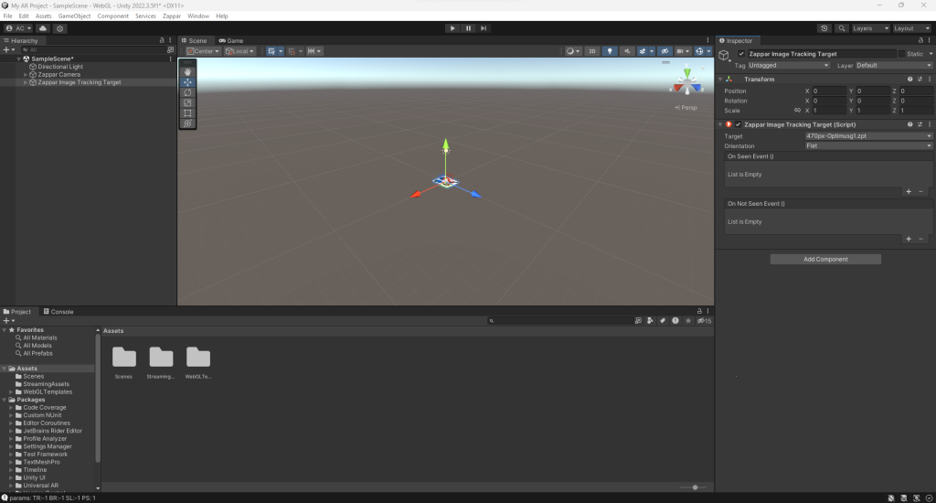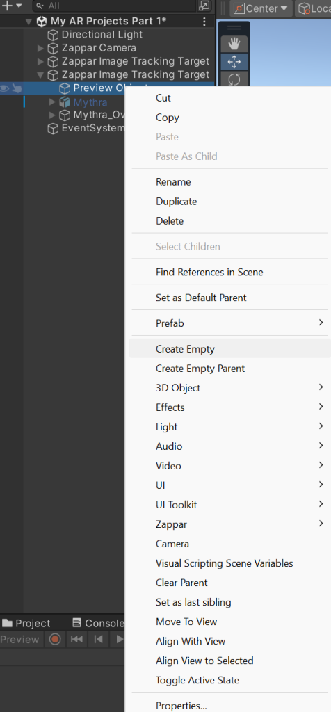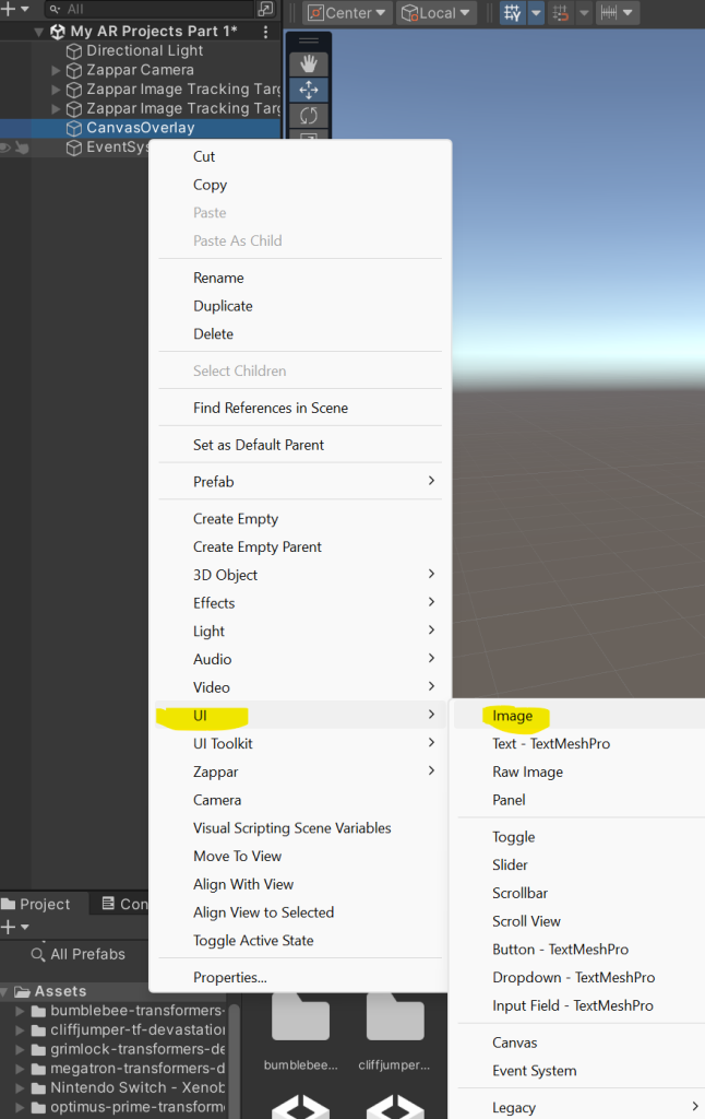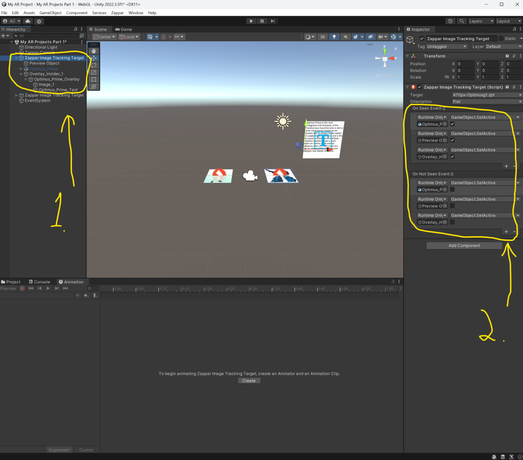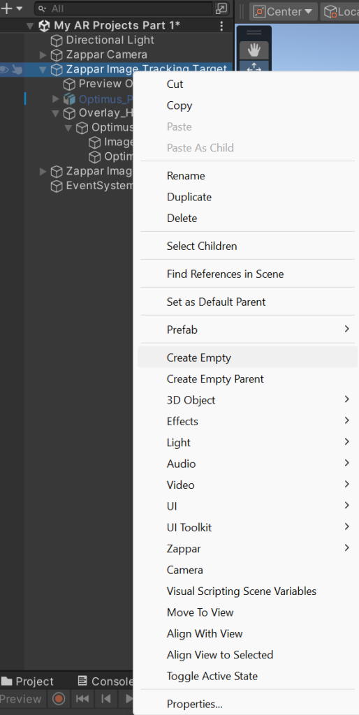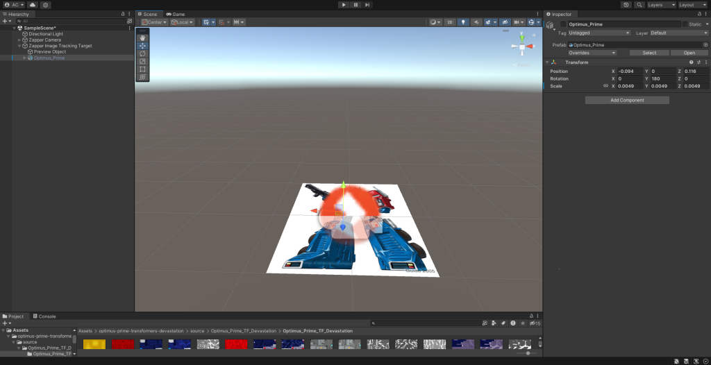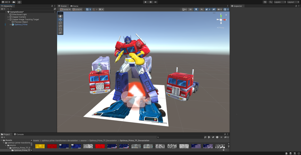 I added a rear facing Zappar camera via Zappar, Camera and Rear Facing Camera and the Image Tracking Target via Zappar in preparation for adding my Optimus Prime image tracker. Then, I went through the same process for both my Zappar Camera and Optimus Prime image tracker as I did for my Sea Shack AR Projects and also made a Preview Object the child of the Image Tracker of Optimus Prime.