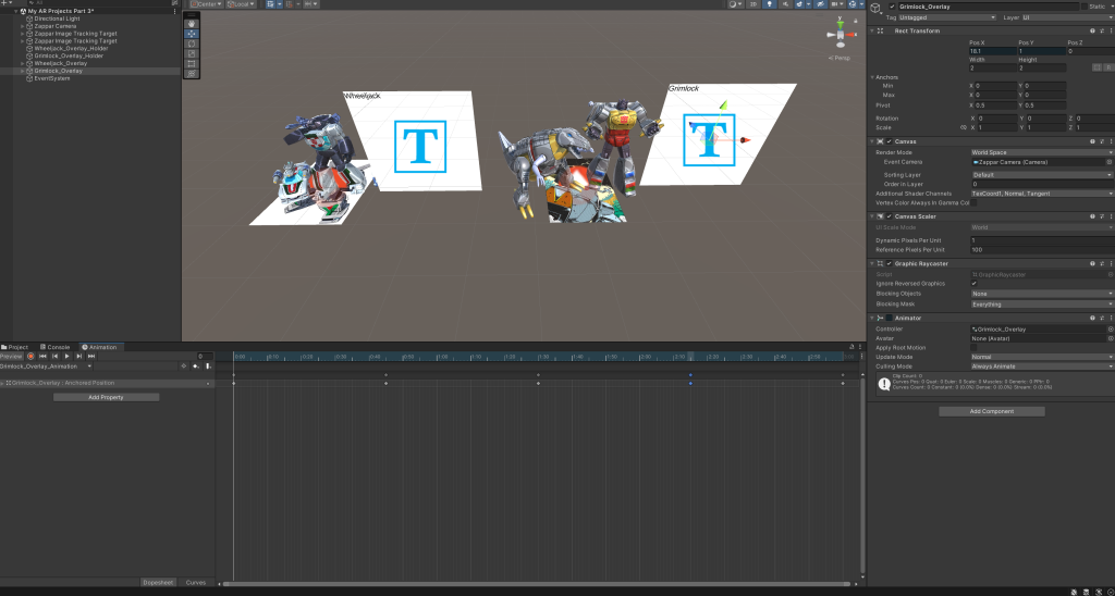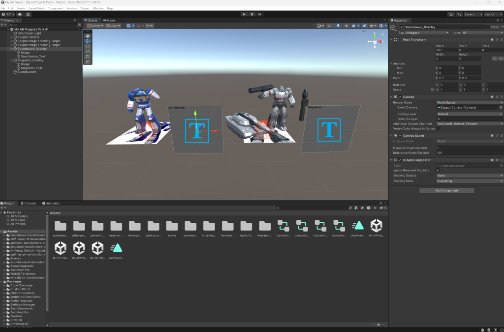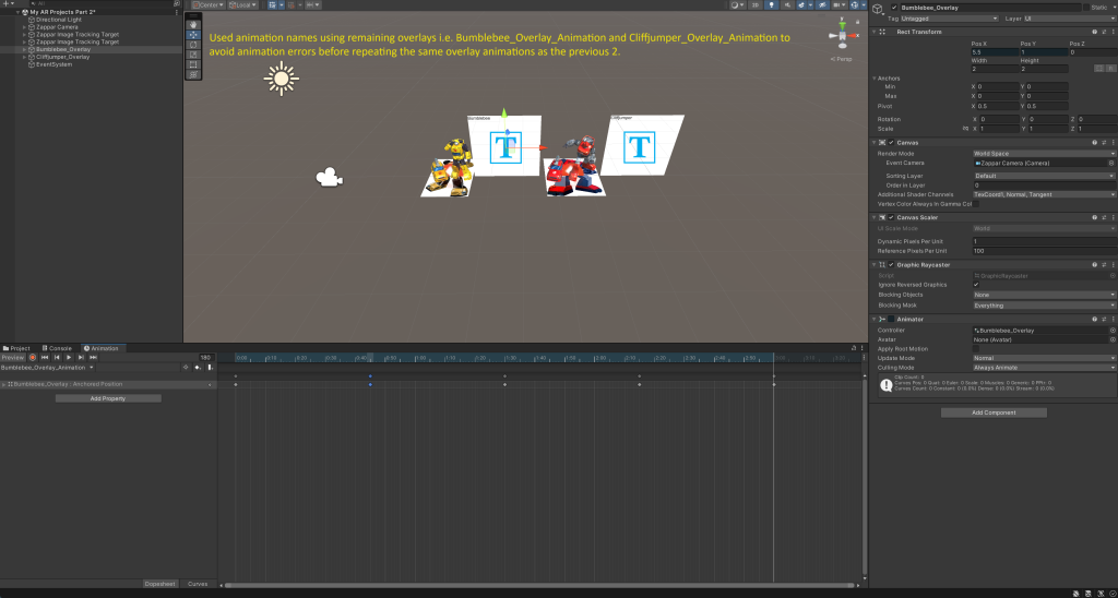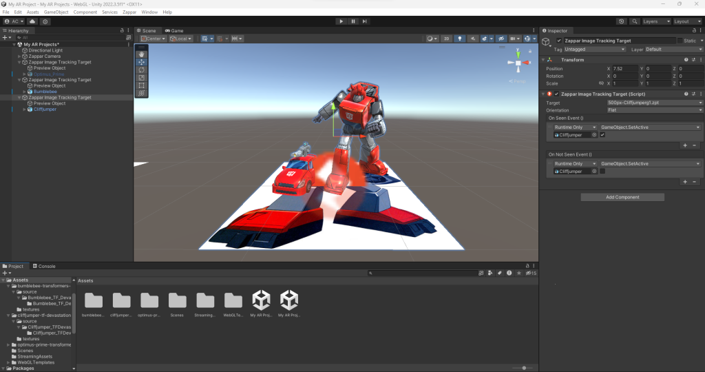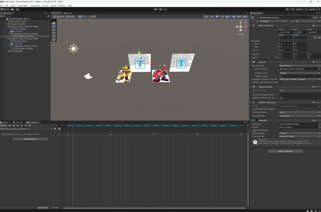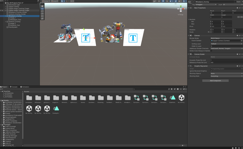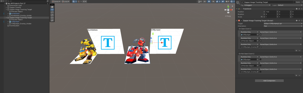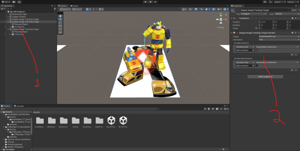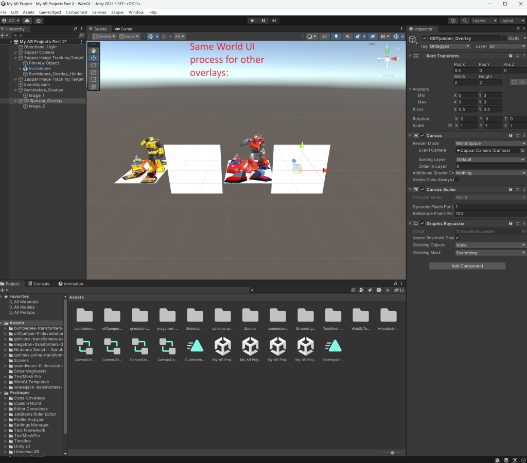 There were issues with the Bumblebee and Cliffjumper AR project as they were missing their overlay holders, so I went back and added them for Bumblebee and Cliffjumper’s overlays.