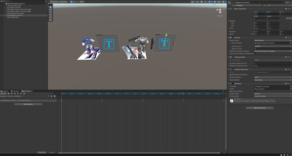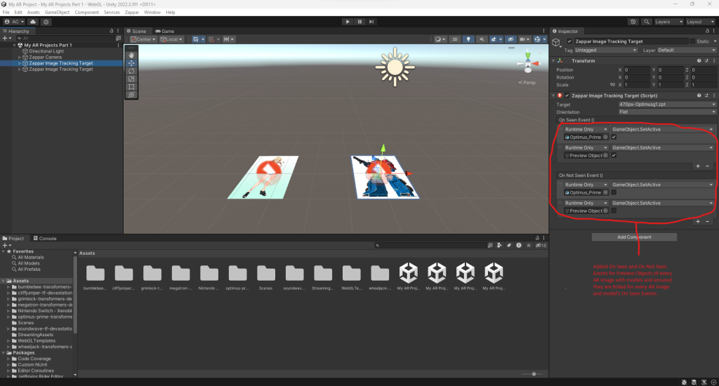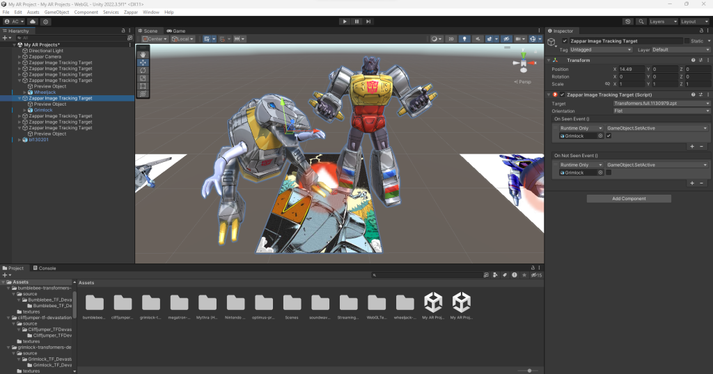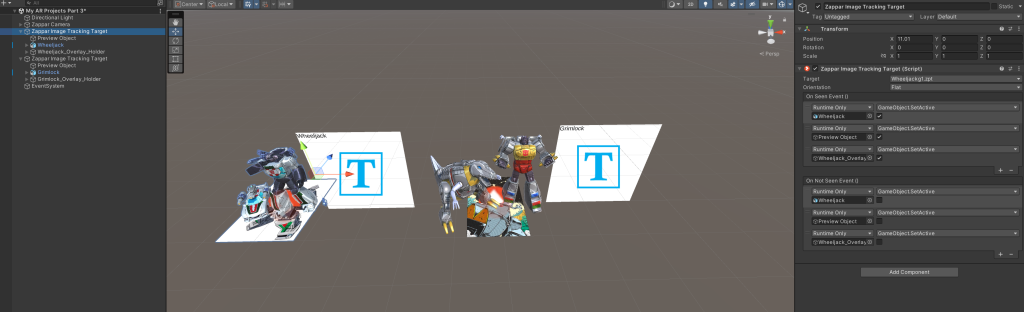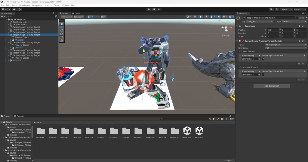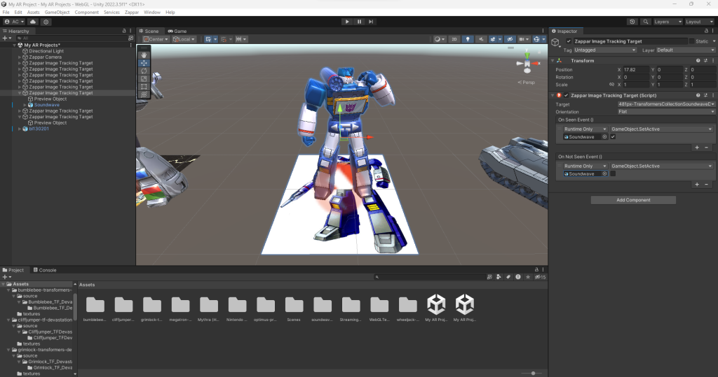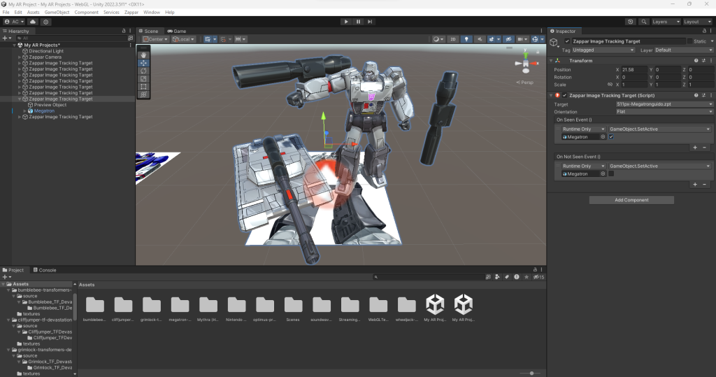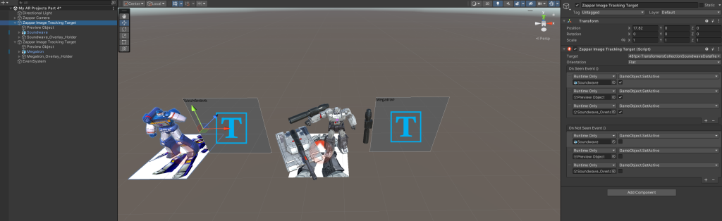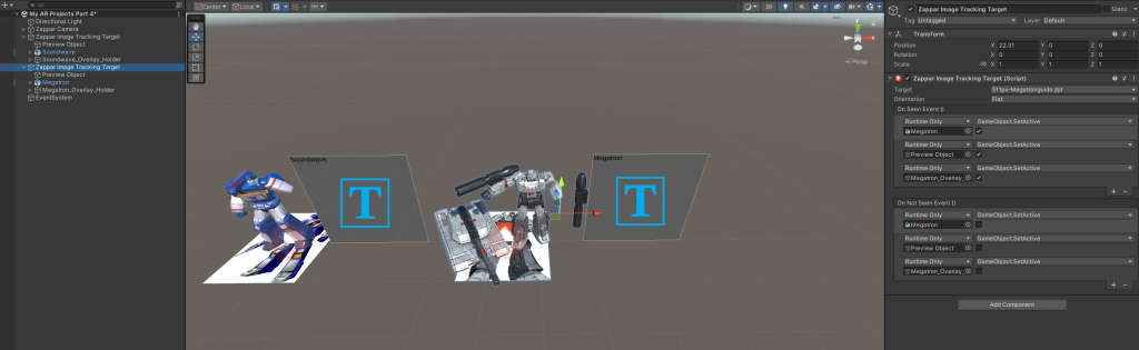 Then I went through the same process of adding On Seen and On Not Seen events with set active booleans for the remaining models for Mythra, Wheeljack, Grimlock, Soundwave and Megatron and ensuring they are all ticked only on their On Seen events in order to test them out after they are saved and had their AR project build zipped.
