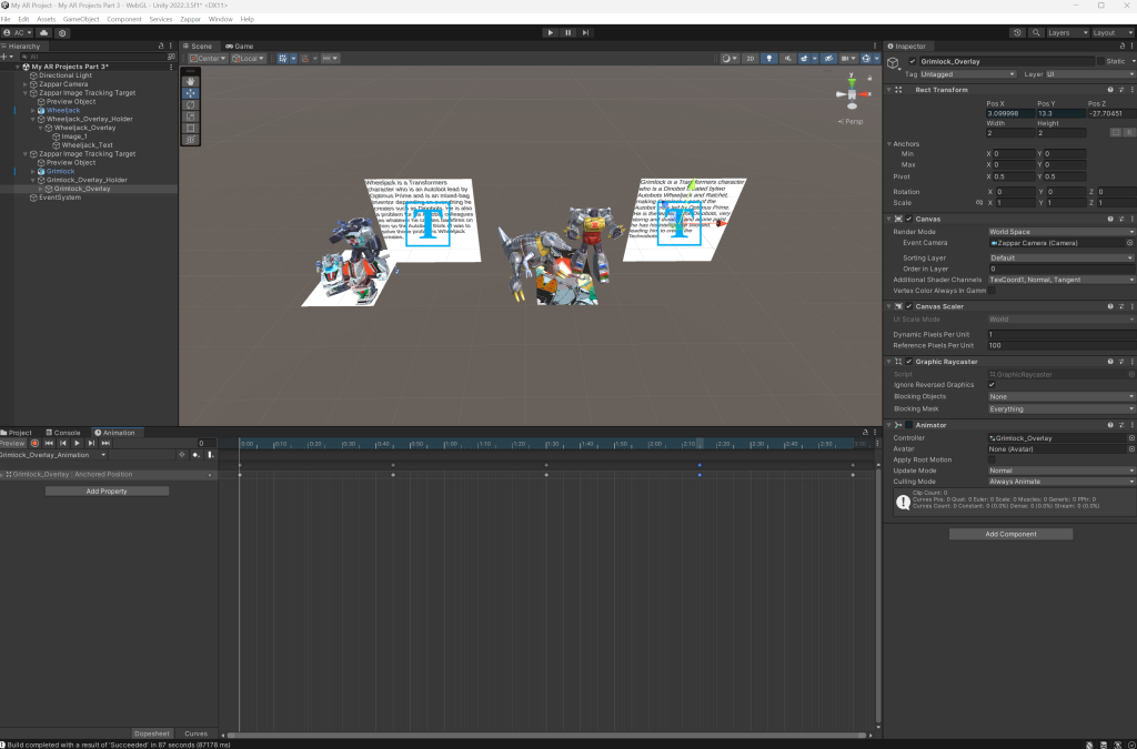 Afterwards, I repeated the process of rebuilding the updated build zip file for trackers of Grimlock and Wheeljack to put onto Zapworks and publishing its project with the latest version to ensure it worked well.
