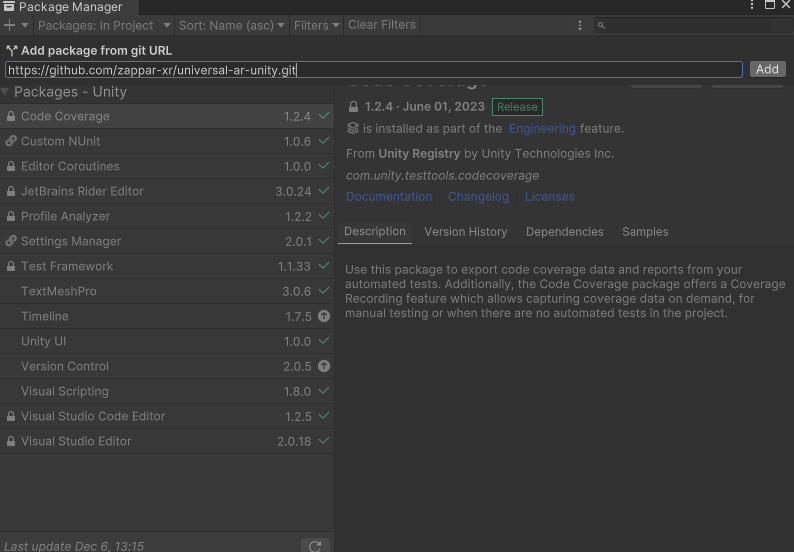 Next, I copied a link with github for Zappar Camera before I went on Package Manager, right clicking on the black text box to paste it, adding the Zapworks Package in order for Zappar Camera to be used for the AR project Unity scene. From what I have experienced using Unity with my laptop, Zapworks Package in Unity only works for PCs in University buildings such as Media Hub and DAIM Science, not on iMacs and MacBooks.