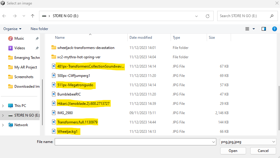 Next, I added 5 more images for Mythra, Wheeljack, Grimlock, Soundwave and Megatron I have downloaded onto the same USB memory stick as every other model and image I downloaded at that time and that I added as 5 more image trackers. The images I added to the Unity scene at that time are referenced in this post.