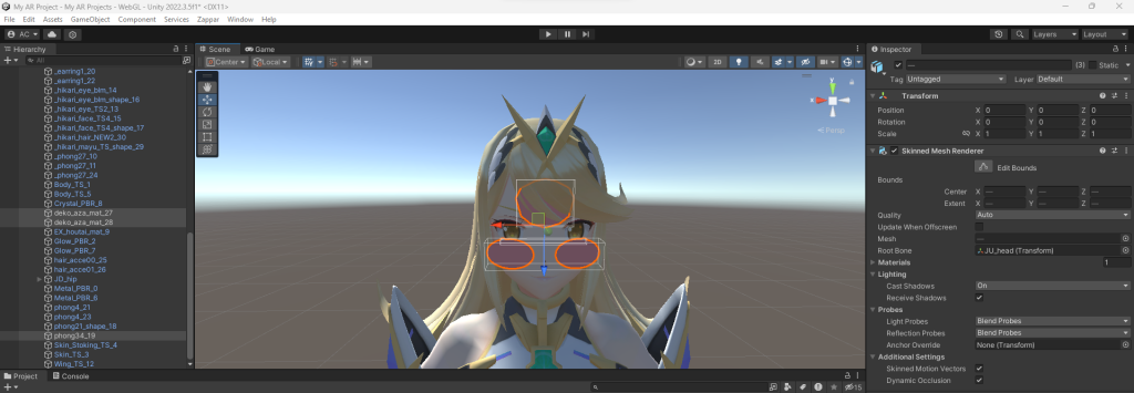 A new technique I have learnt is deleting objects I do not need for my AR projects. This applied to the Mythra model that had objects that are put for her forehead and cheeks, but I didn’t need those objects as shown in the image where I highlighted these unwanted objects and right clicked them to delete them.