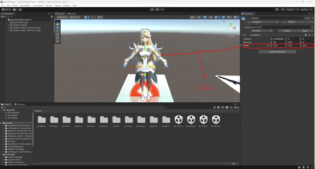 I then decided to back on Unity and rescaled her x, y and z sizes to 0.01 to ensure the model for Mythra is tall enough to see, since I tested Optimus Prime and Mythra’s AR trackers out, finding out that the model for Mythra was too small.