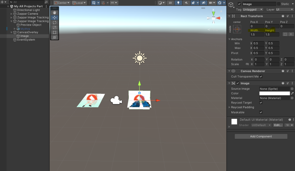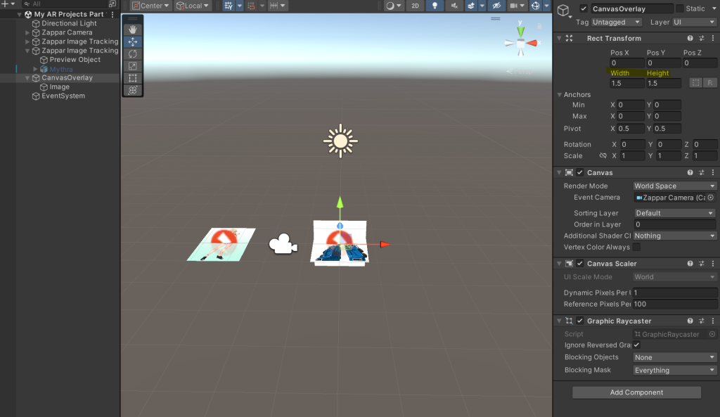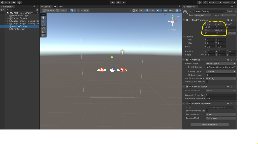 I then clicked on the Canvas Overlay where I dragged the Zappar Camera to a black box next to Event Camera to ensure every Overlay would be seen in AR projects. I also adjusted the overlay’s x and y position axis, as well as its width and height, which are more new techniques have learnt.