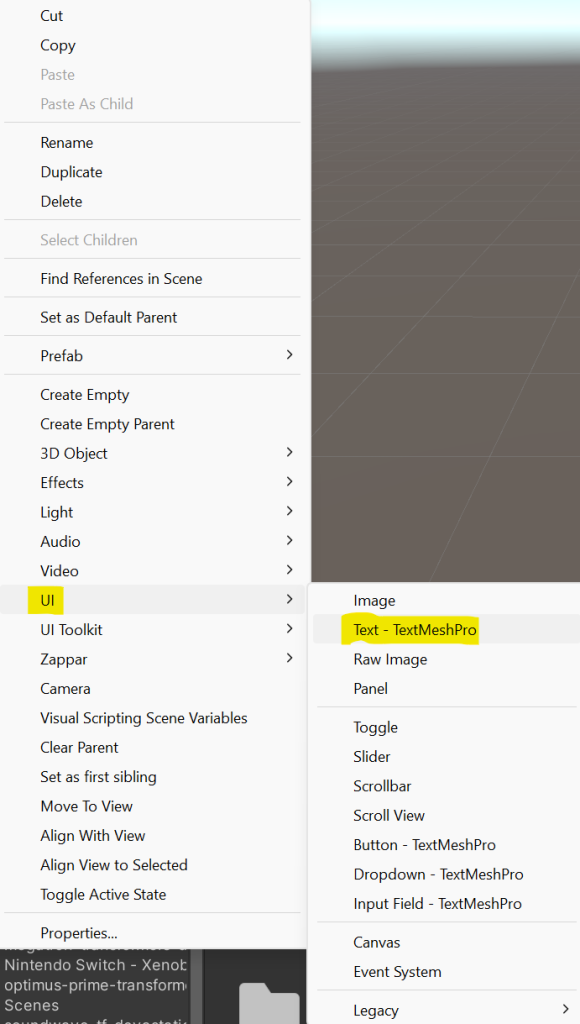 I created a text via Right Click on CanvasOverlay, UI and Text – TextMeshPro, ticked its colour gradient and set its font colour to black so I can see whatever I type.