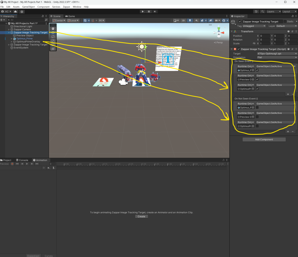I then repeated the same process of adding On Seen and On Not Seen events for the overlay of Optimus Prime.