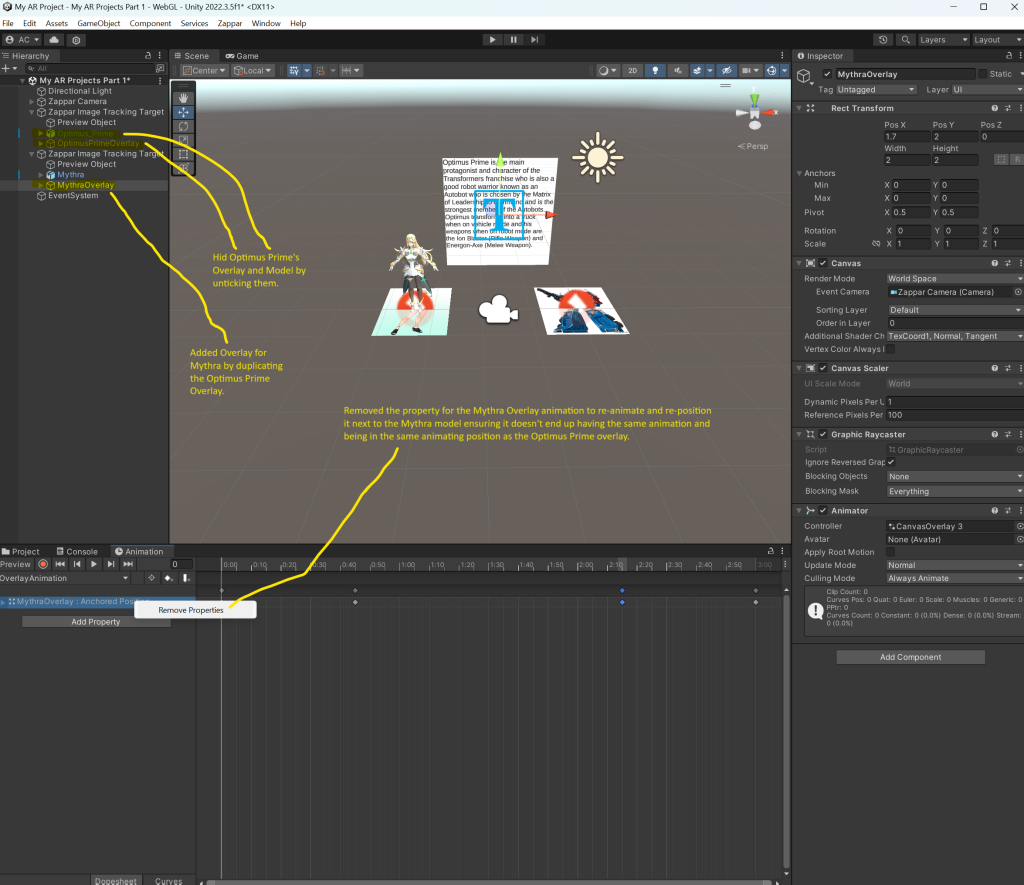 This image has labels that show what I have done looking at it, but firstly, I cloned the Optimus Prime overlay before I hid the main character’s overlay and model by unticking them in order to make an overlay for Mythra. Afterwards, I removed the anchored position property for Mythra’s overlay to re-add it to ensure the animation would work.
