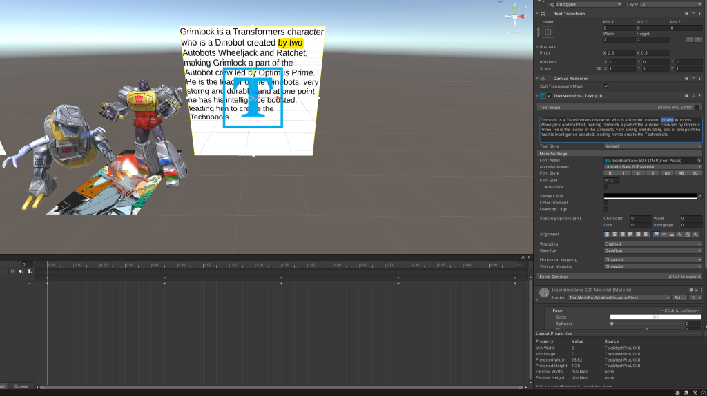 I went back on Unity and clicked on Grimlock’s overlay text to click between the words ‘by’ and ‘two’ to space them out one time.