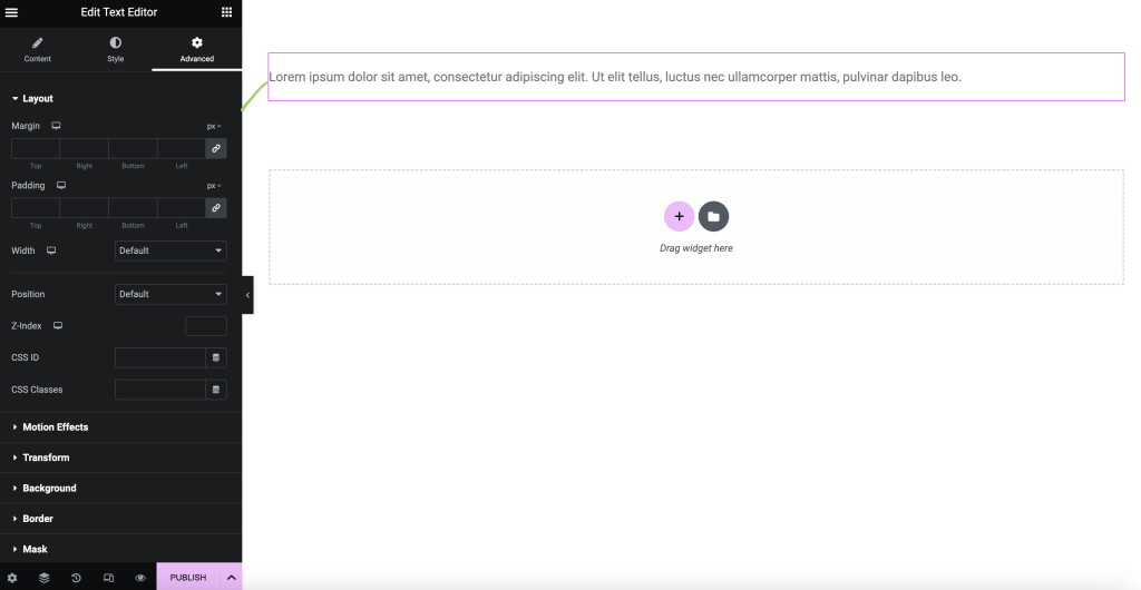 For texts, follow the same process and choose the text editor box to drag it onto the rectangular + button to be added and the text should start with Lorem. You can remove Lorem ipsum words and type anything you want or type professionally. You can also change the font size, add bold, italic and/or underline and use its tools such as added/inserted links and lists whether bulleted or numbered.